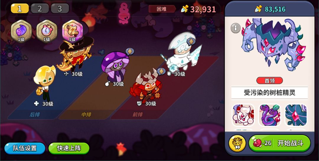 本期带来的阵容适用于第五章困难模式的所有地图,如果各位缺少某个饼干,可用同类型饼干进行替代即可。前排可以用同类型超稀有的防御或者突击替代,恢复饼干同理,输出饼干避免使用甜辣酱,其他输出饼干均可。