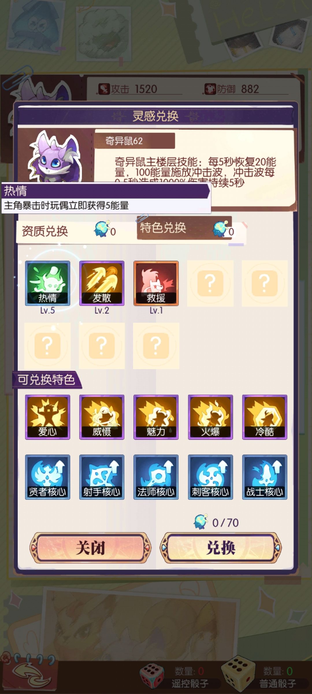 【两种骰子耗尽】后,自动结束,进入【结算界面】,【完成兑换】后将获得不同数目的【五种点心】,点心【自动投喂玩偶】进行升级,玩偶等级在【更换玩偶时无损继承】