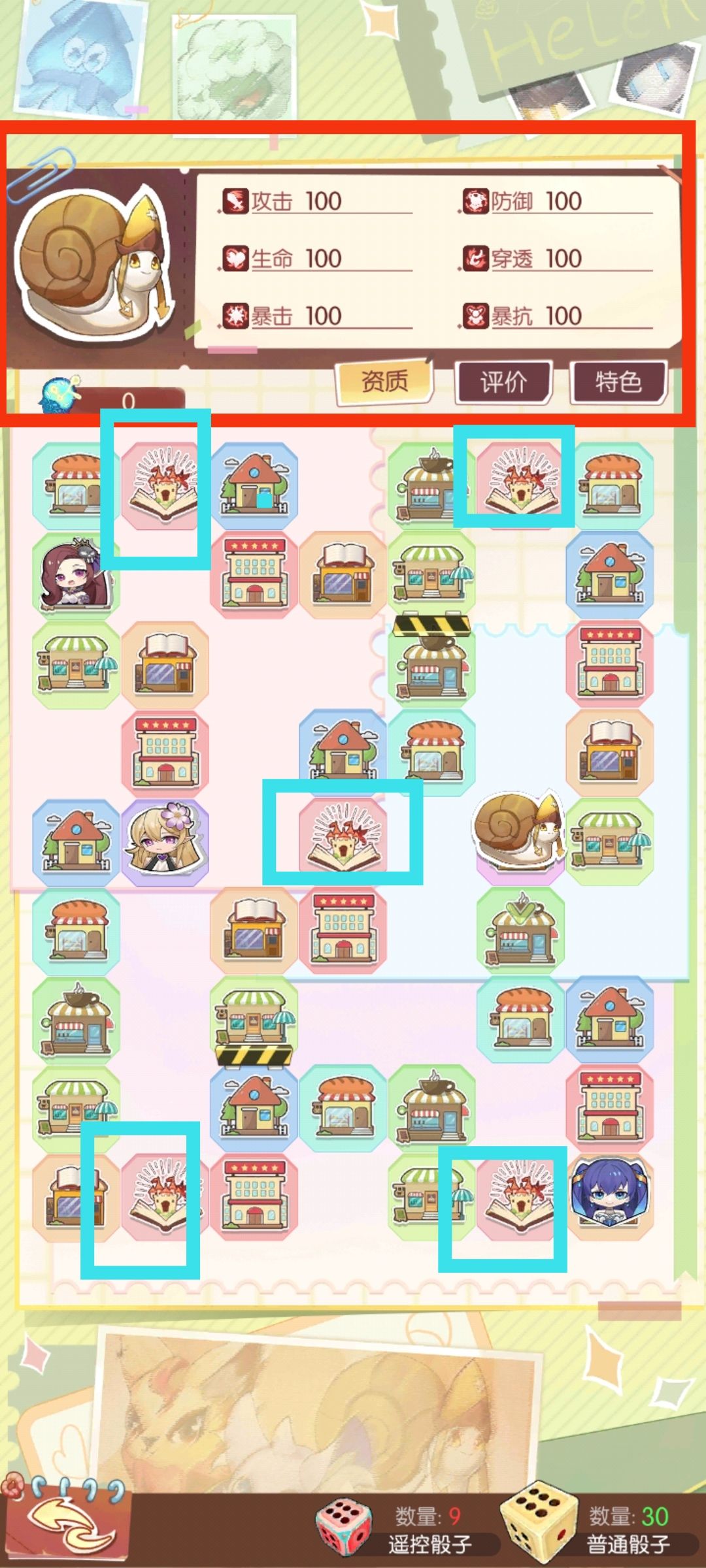 通过丢骰子在地图上移动,可以获得资质点数,【不同建筑】的养成方向也不同,在这过程中,要【尽可能多的走到蓝色框标识部分的格子】,也就是童话故事格