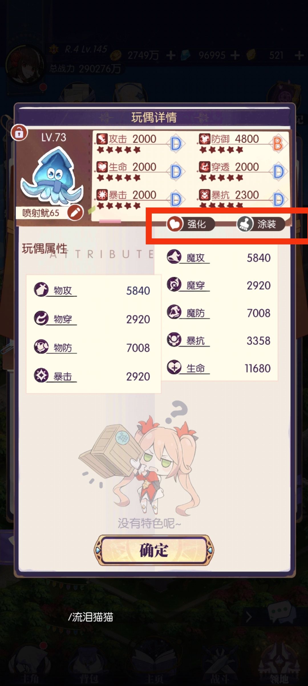 开始之后,我们会获得一个【全资质100,无特性】的玩偶(红色框部分可以查看当前的资质点数和已有特性及其等级)