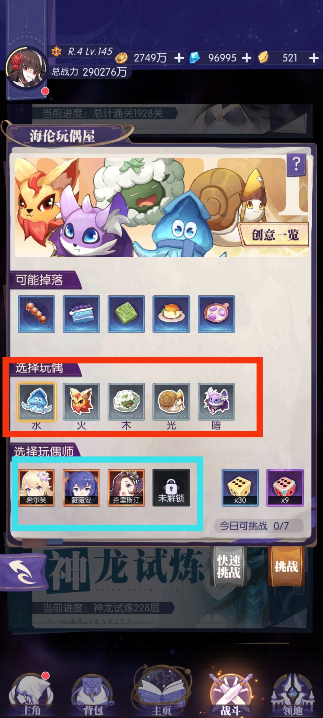 进入之后呢,就是这个界面。红色框部分是选择本次游玩获得的【元素玩偶种类】,蓝色框部分是选择出战【玩偶师】。可根据自身需要进行选择。