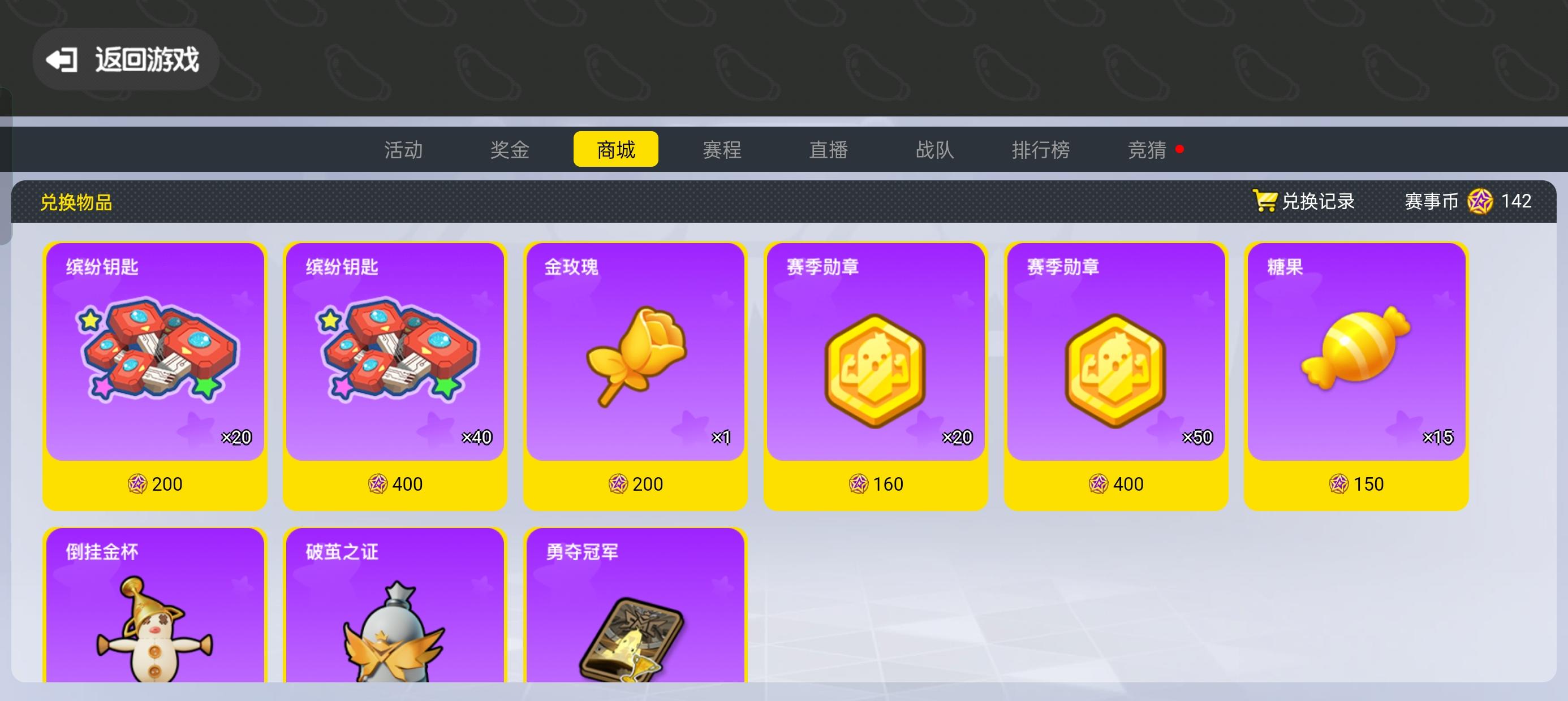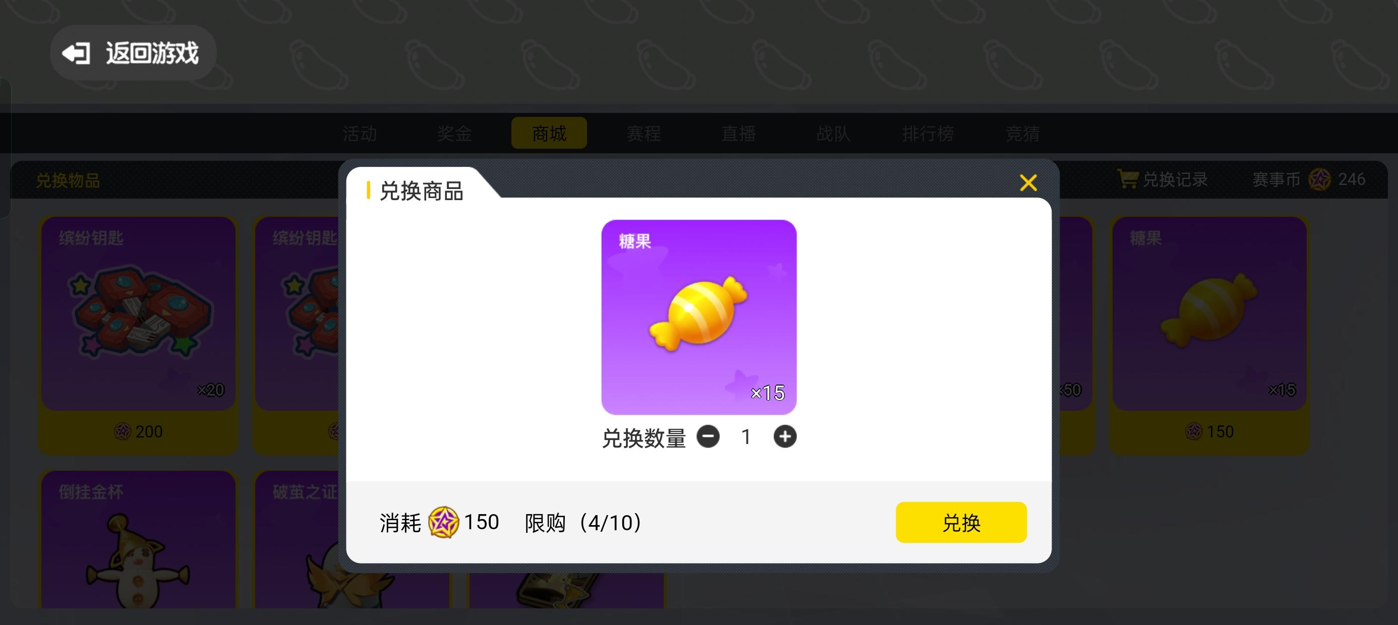 一共消费1500赛事币可兑换糖果:150