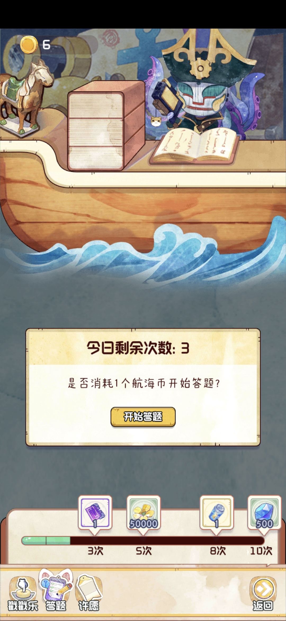 在码头探险可以获得航海币。使用航海币可以参与右上角的航海活动,在戳戳乐和答题中均有机会获得大量钻石。