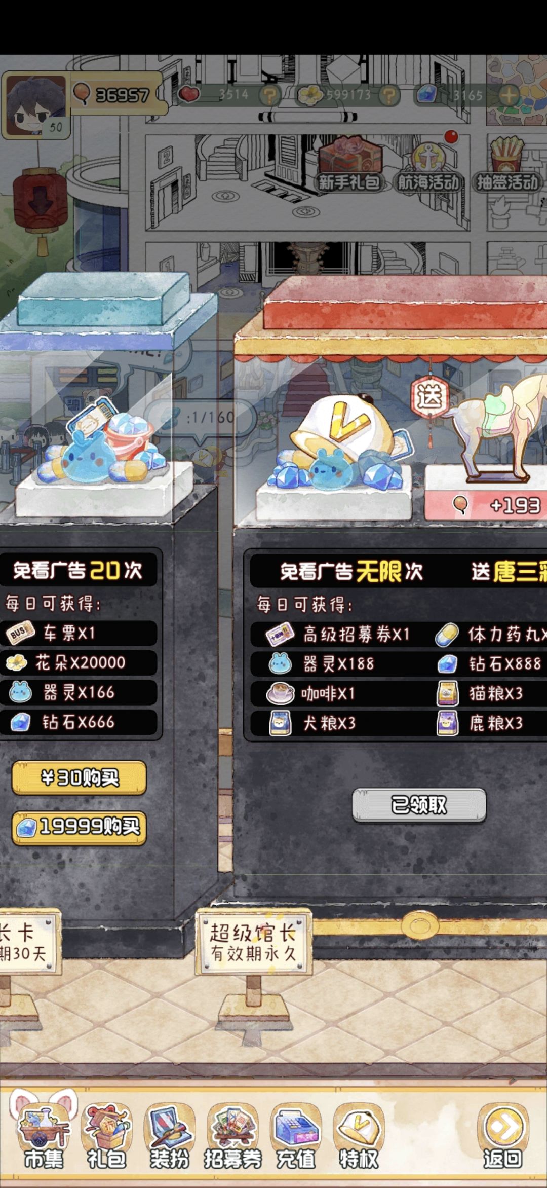 月卡花费19999,收益钻石19998大量花朵以及其他道具。永久卡每日可以领取888钻石,无限次跳广告,还送一个唐三彩。大家量力而行。如果有余力的话还是更建议永久卡。毕竟无限跳广告可以让游戏体验有质的飞跃。