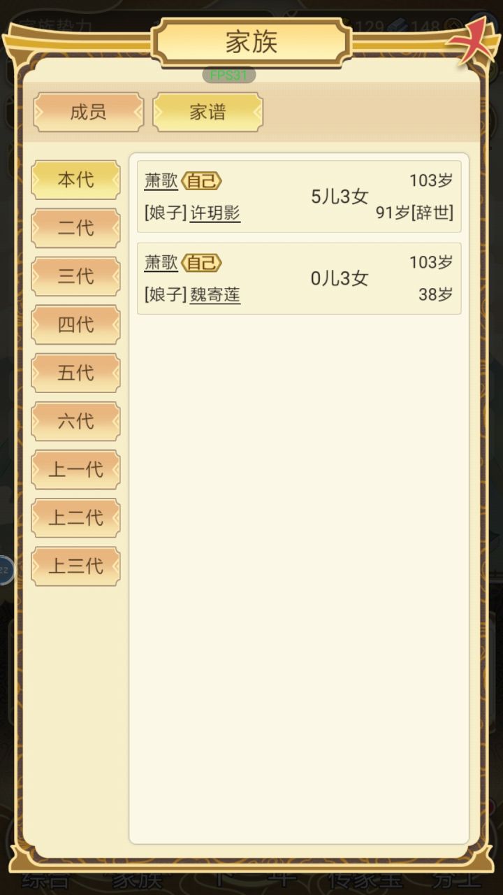 所以重点男武女文,女二代早点结婚,男二代到退休结婚,这样避免3代没人,后代没能力者,看到这里可能还没能理解这样安排,这里说下游戏生娃bug,女孩可以生到50岁,男的生到100多岁,我的家主就103生了女儿