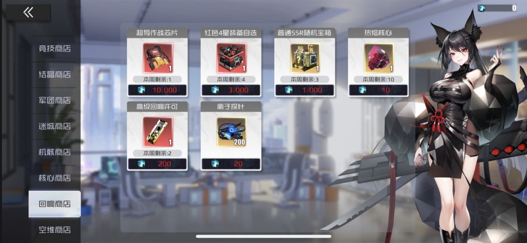 9 回响商店:白嫖的话 继续换高抽,10抽回一张;红卡满星的大佬 可以换装备或芯片,个人还是觉得装备好,毕竟是4🌟的