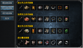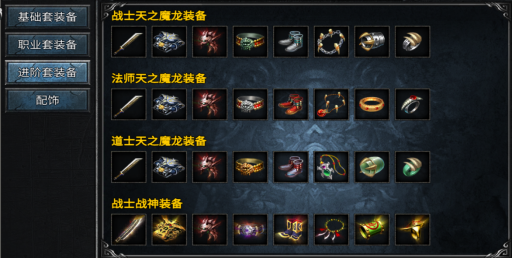 三职业装备分为三个等级,分别为基础套装备(沃玛--祖玛--天之祖玛--赤月),职业套装备(天之赤月--魔龙--天之魔龙--强化魔龙),进阶套装备(天之魔龙--战神--天之战神--星王),玩家可通过怪物掉落获取