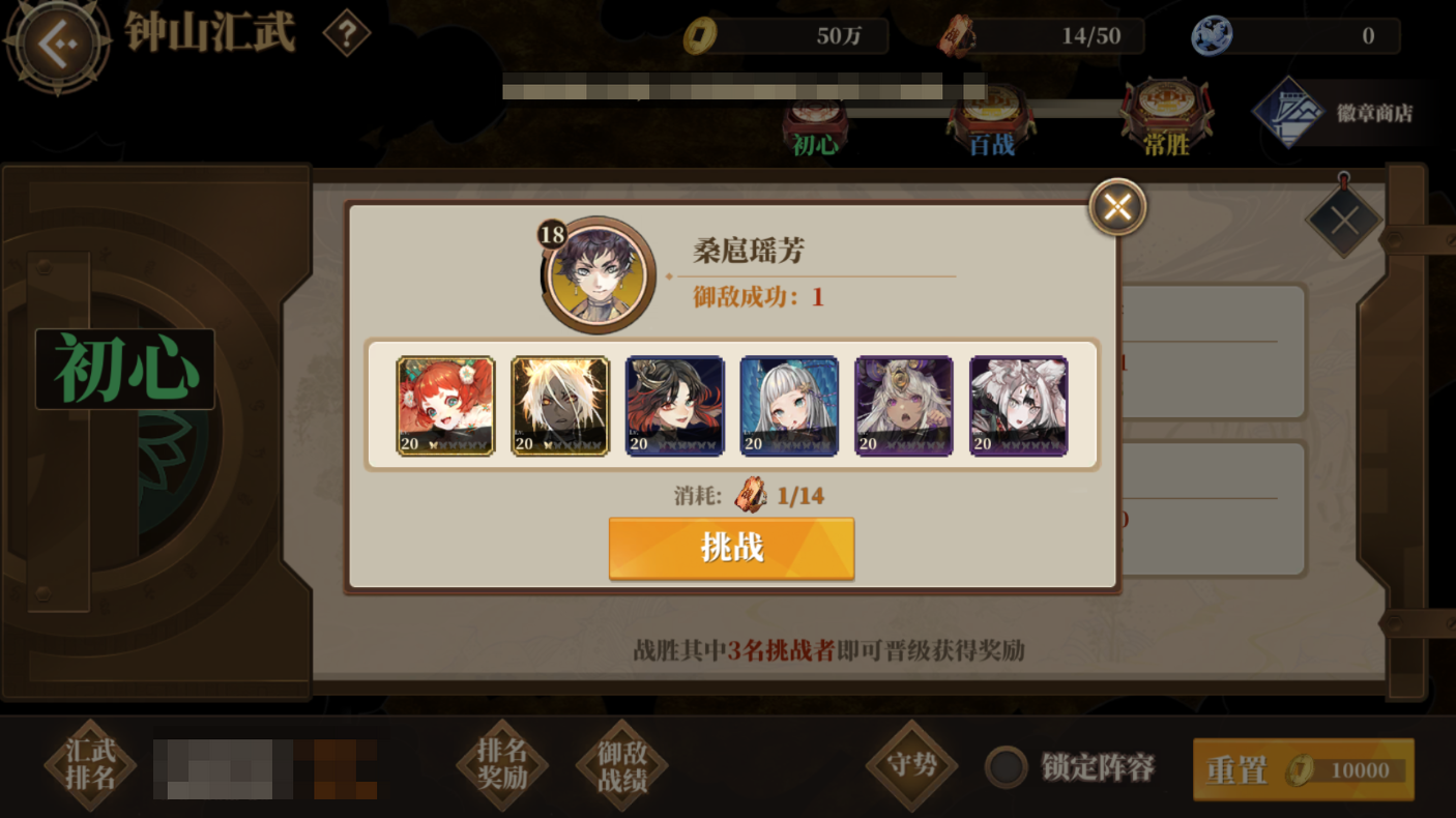 【钟山汇武】每轮共有3层,分别为:初心、百战、常胜,每层随机匹配4位对手,龙子大人可以自由选择要挑战的对手。每次挑战需消耗1张挑战券,挑战券在【历练】【姑瑶幻境】【昆仑之墟】【灾祸之渊】副本中均有概率掉落,挑战券上限为50张,达到上限后将不再获得,龙子大人记得及时使用哟~