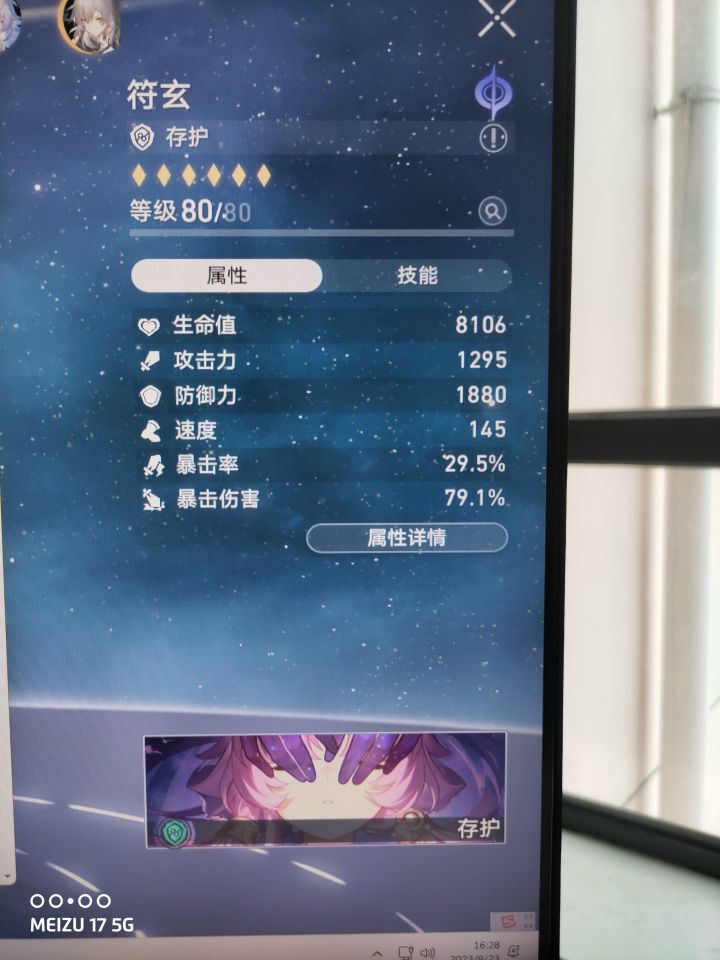 但你如果用生命绳,副词条有速度就行。这样就算强化很非,0+0 符玄应该差不多是 8000 血,150 速,1500 防御。