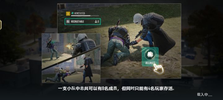 9.倒地自己可以被敌方招募,也可也招募敌方对方,这样可以逃跑的掉线的死去离开的玩家,就剩自己了可以打到对方玩家不打死他可以把他招募自己队里拉他起来跟自己一起作战成功吃鸡