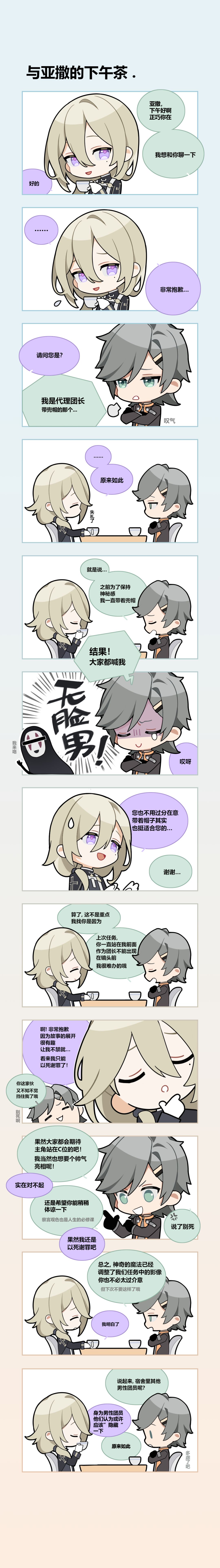 下午茶时间,剧团小工们决定偷溜去偷偷摸鱼,恰巧碰见了团长大人和亚撒在聊天。