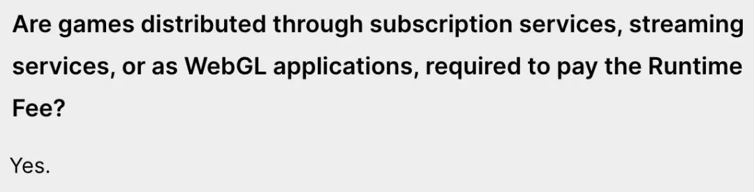 更加离谱的是,关于玩家通过订阅制服务获取的游戏、串流或WebGL等方式是否收费的问题,Unity给了言简意赅的答案: