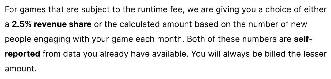然而CEO是不可能换的,价格也是不可能完全不调整的,Unity最新的政策调整非常鸡贼的选择了一个很微妙的尺度,看似做出了巨大让步,但收“安装费”这个核心没有变。
