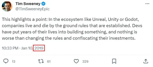 Epic的CEO Tim Sweeney早在2019年就说过这样一段话:“像虚幻引擎、Unity引擎或者Godot引擎这样的生态系统里,那些基本原则会决定公司的生和死,开发者花费数年的生命去打造一款作品,没有比改变规则并让他们的投入付诸东流更糟糕的事情了。”