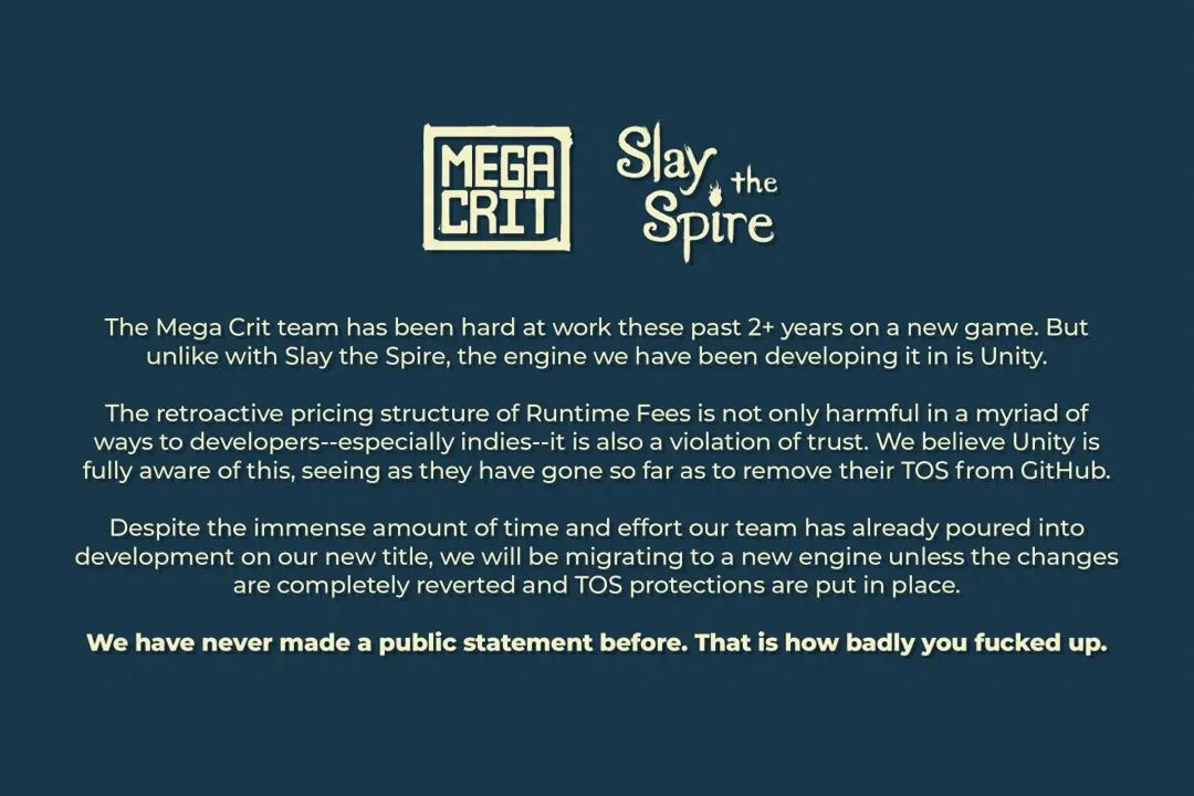 在接下来的这一周里,发生了太多太多的事,有《杀戮尖塔》等知名大作的开发者当即宣布将抛弃Unity引擎;有全球数百个开发者联合反抗Unity的收费政策;有虚幻引擎和Godot引擎喜从天降狂开香槟;有9月18日Unity既不光速也不滑跪,毫无诚意的道歉;也有搞不清楚状况的路人玩家凑热闹围观。