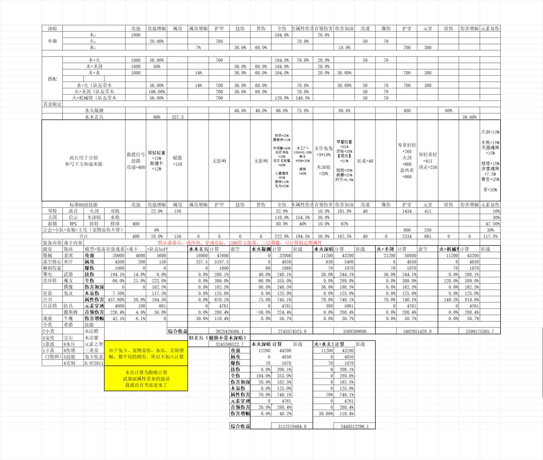 第二,从我表格的计算结果来说,在队友携带木深暗下,水火深暗的限定是完全有能力挑战玄兵地位的,从其他大佬的口中也了解到,水火深暗是有替代玄兵的能力的。