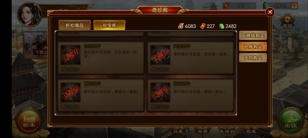 2.奇珍阁里面,每天的折扣商品,优先买带技能的装备,然后是点将台的白嫖武将。五铢钱和礼券主要消耗的地方就是奇珍阁,把所有物品白嫖完,别用玉符买。。(玉符优先留着自建女武将和其他地方用)
