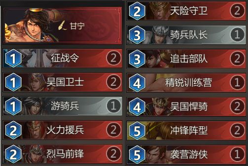 梦梦小贴士:可以看出甘宁作为吴国的骑兵具有极强的进攻能力,卡组携带大量骑兵可以快速打击敌人造成伤害,是非常强力的快速获胜卡组,同时依靠骑兵本身的联动效果可以快速增加攻击力和生命值,让敌人难以处理十分头疼。