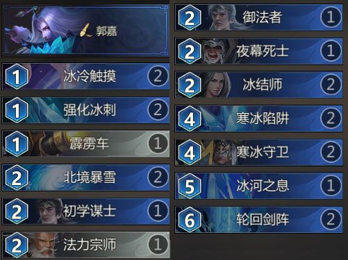 梦梦小贴士:不难看出,郭嘉的核心玩法是通过携带大量具有冻结效果的卡牌来触发被动,从而积攒出多张的【冰刺】,配合增加法强的卡牌来打出“成吨”的伤害来击败敌人。