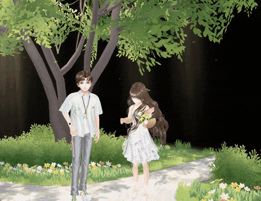 她从怀中的花束里摘取出最美的一朵,眼含笑意地赠予了他~