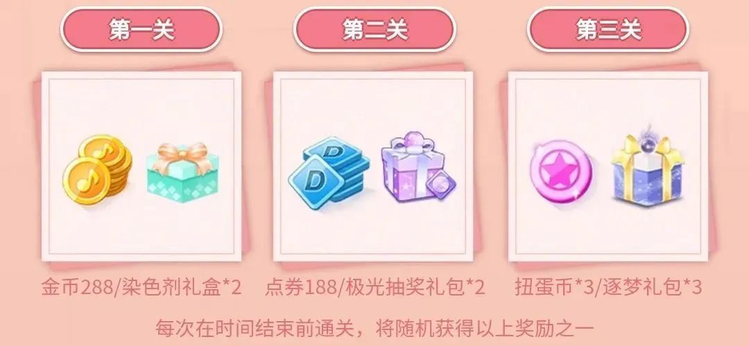 9月23日至10月6日期间,玩家通过邀请默契官玩家/完成页面任务获得时钟道具/开局次数(符合默契官玩家身份条件为:2023年9月23日0点后新注册账户的玩家或2023.9.1-2023.9.22未登录游戏的玩家),每通过“翻牌配对”小游戏一个关卡可随机获得金币*288/染色剂礼盒*2、点券*188/极光抽奖礼包*2、扭蛋币*3/逐梦礼包*3奖励之一;