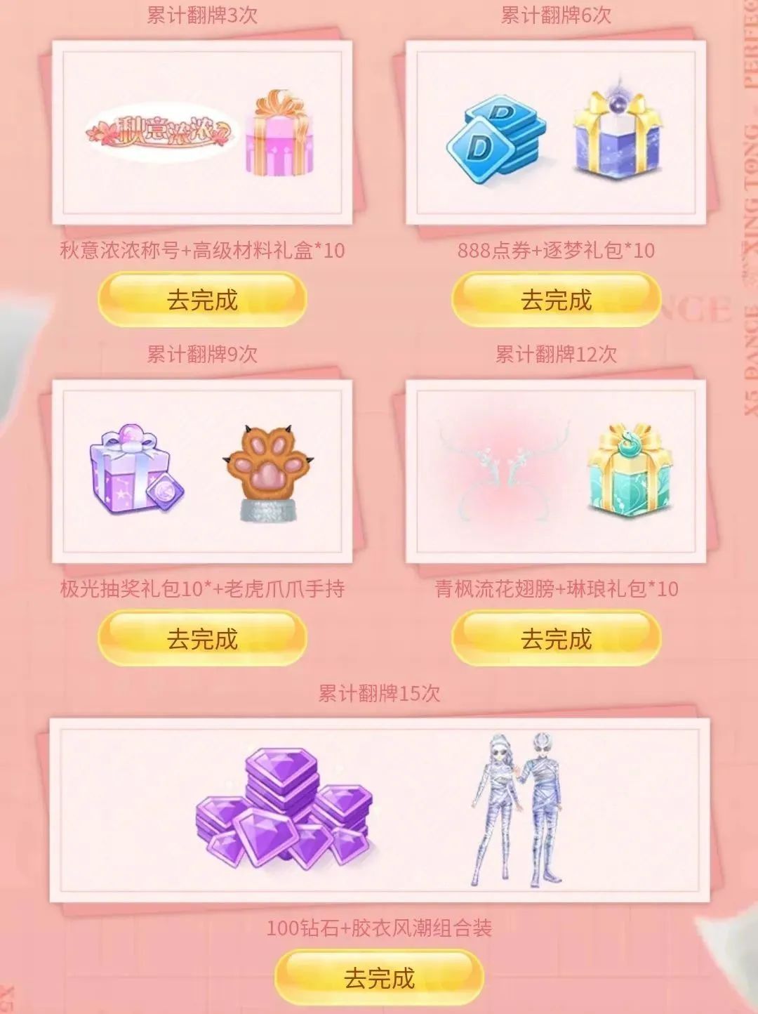 累计翻牌指定次数可得钻石*100、秋意浓浓称号、老虎爪爪手持、青枫流花翅膀、胶衣风潮组合装等奖励(具体规则请以活动页面为准)。