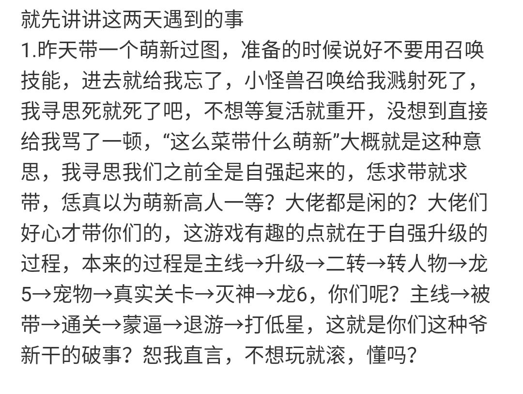 我就这么讲了,过不去就是菜,菜就要多练,没资源就打,没心就签到,有问题问别人,别天天跟皇帝似的,真当我们都是太监?给恁换尿布需不需要?还有那些质疑我是不是坑萌新的,自己去我们群里问问,我有没有坑萌新,是不是一心给萌新解惑,要有人说我坑萌新,截图发上来我当场删号退游,行?就这些