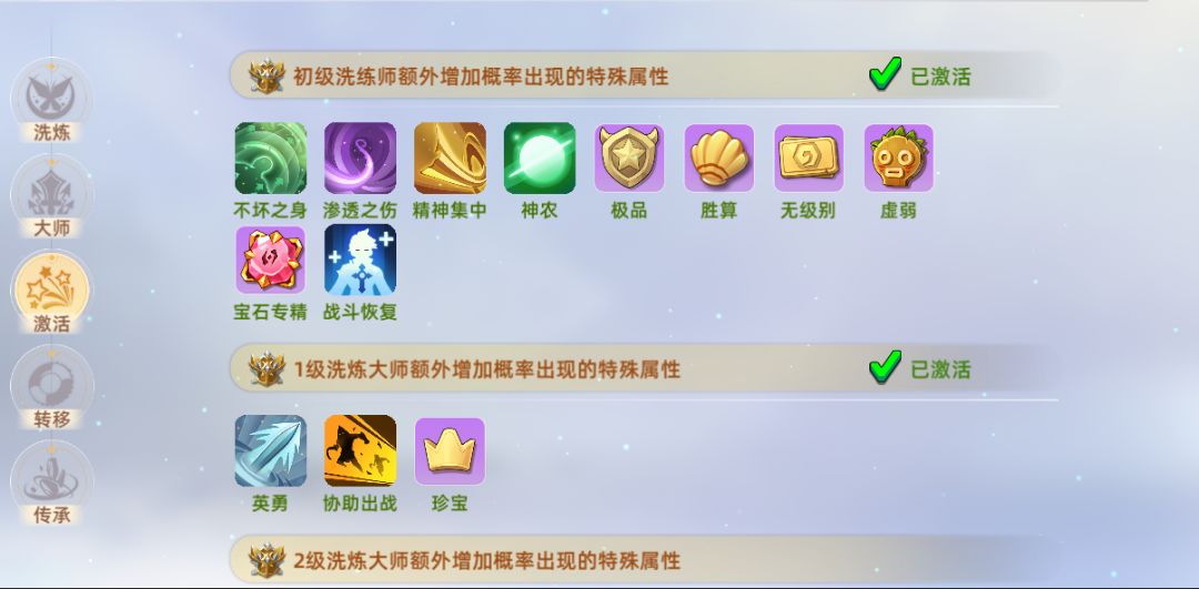 洗练大师:每次洗练增加2-4经验值,达到对应等级即可激活对应隐藏技能并且提高获得高品质属性的概率