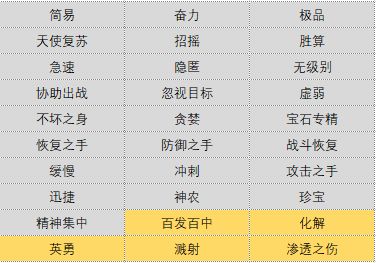 图内为洗练中可能出现的隐藏属性,大部分词条概率为2%-3%,少部分词条概率更低(图中黄色区域)为0.4%