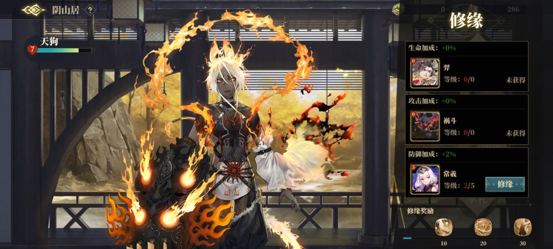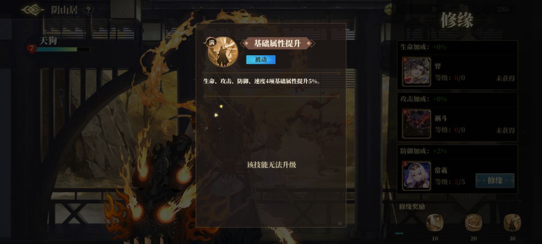由于所有角色修缘的加成都是一样的所以我们这边就以天狗为例进行讲解!我们可以看到修缘的加成分别为角色受到伤害降低10%.造成伤害提升10%.以及生命攻击速度基础属性提升。。。没错!!!!就是这么霸道加成!前两项是角色最终面板越高提升也就越大!而第二项直接加成基础属性!生命加成,攻击加成的器灵一装备,,啧啧啧。