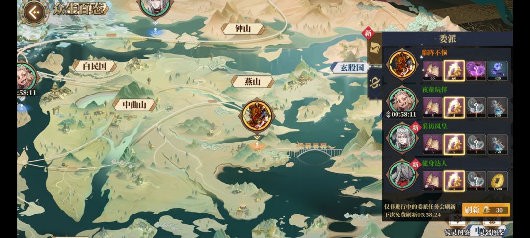 那么最后我们进入修缘材料获取阶段,修缘材料就是这个像书册一样的东西,只能通过委派进行获取,其中委派任务分金,紫,蓝,绿3种,获取书卷的多少也是依此排列,每隔5h我们会有一次委派免费刷新机会,这里要注意的是!!!!!!![[TapFamily_赞]](https://img.tapimg.com/market/images/ed2de381cc9f9877daa97b039ca6e966.gif)