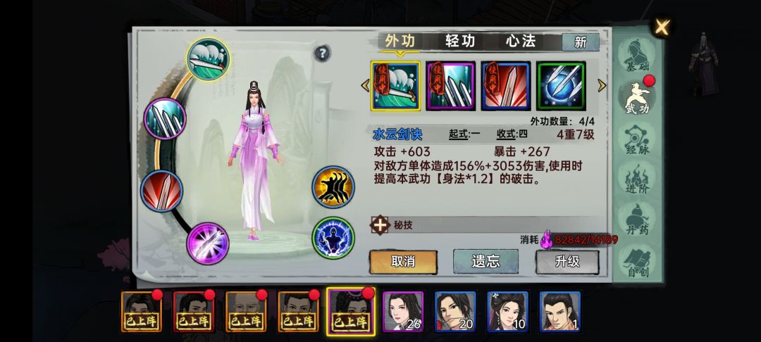 阅历主要来源>秘境,打秘境要攒丹药,不要炼其它丹,就炼加血的,1级金疮药,2级太乙丹,3级灵砂丹,我不知道大家掉落是否和我一样,这三种丹甘草,金银花,九香虫掉落和其他三种完全不匹配,所以平时刷图不要嗑药,打不过就出来,不要担心体力,体力用不完,而且上限300固定死的,不会因为任务奖励而叠加!所以刷秘境后面刷桃花阵全指着药,药怎么用?点布阵,两个+选择药品,进战斗可以点击使用,间隔10秒一次可无限磕只要你数量够,所以重点培养就是主角,加点只加内力和身法无论你学什么武功,武功只影响你外功的伤害和防御没关系,建议学拳脚,因为拳脚主内力伤害加成!