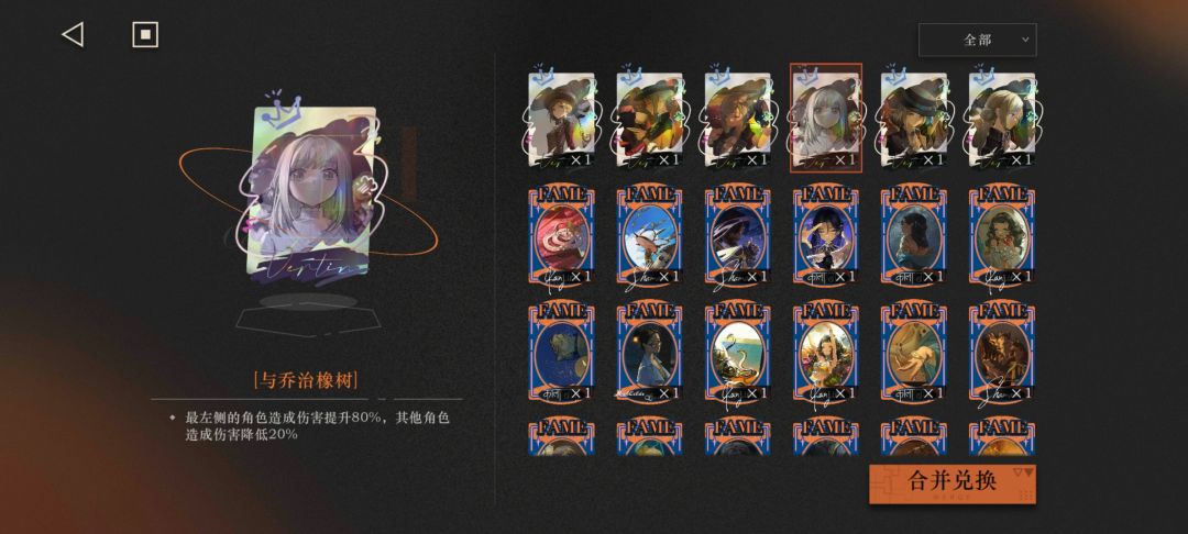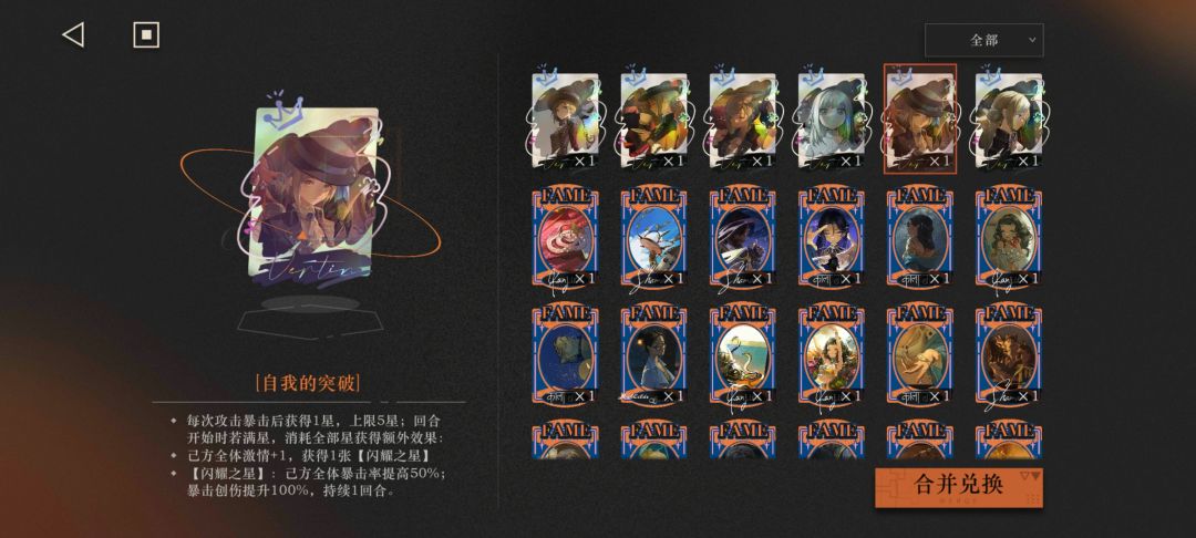 合并兑换:三张同级名人卡可以合成一张同级或高一级的随机卡。因为上场角色不可以携带两张中间图片一样的卡(不同稀有度也算相同),所以每种卡最多给四个上场角色各一张,另外有些增强最左侧队友或开场控制对面的卡片携带多张也只生效一张,多余的可以全部转化掉。