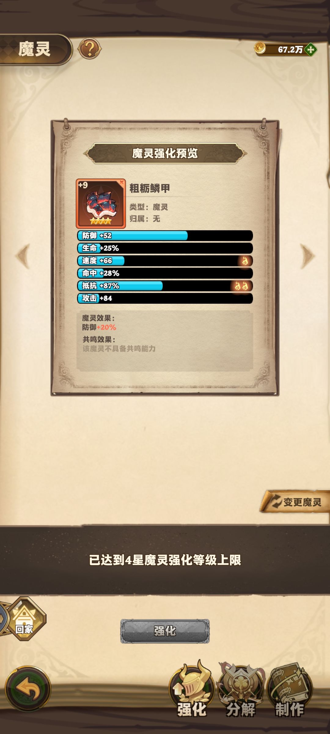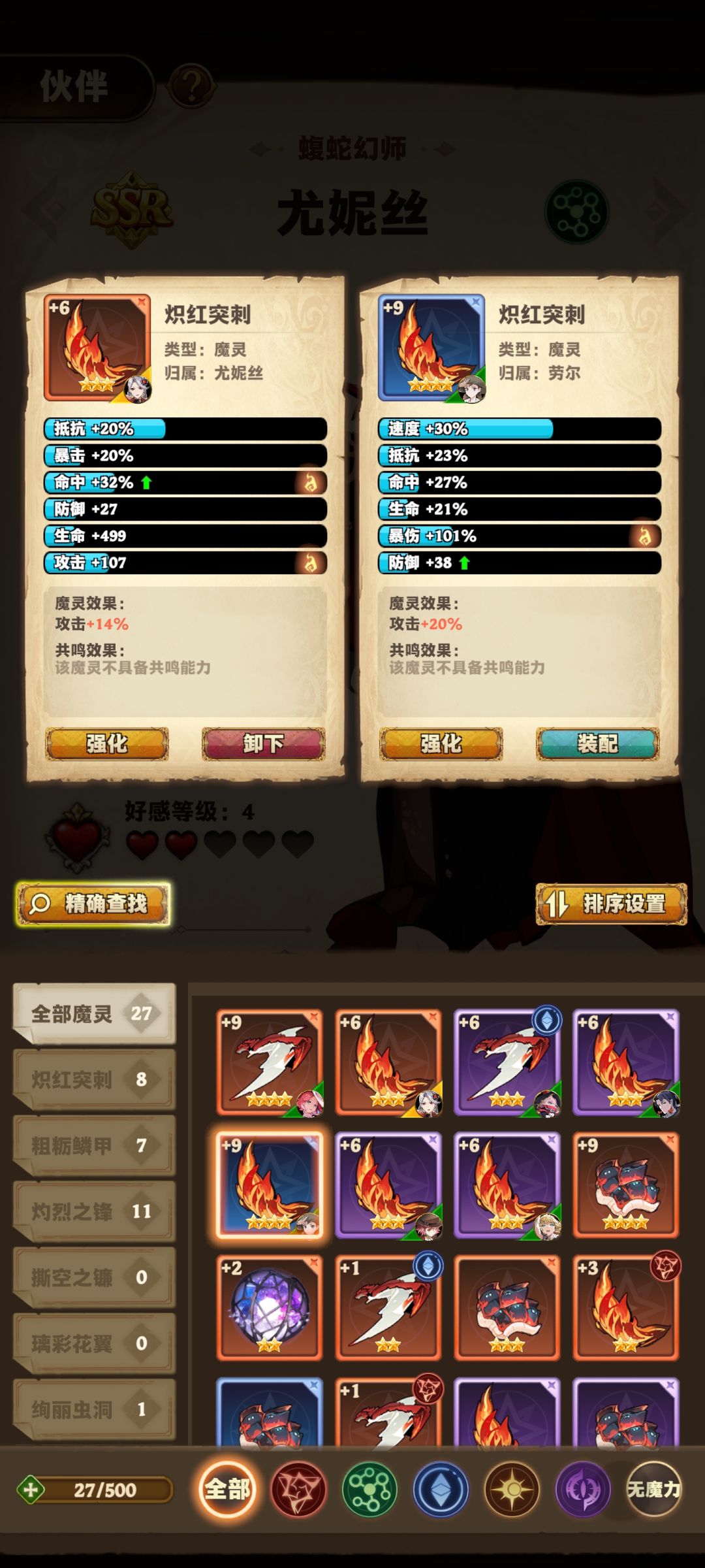 魔灵强化会提升第一个属性,橙色四星魔灵在3/6/9的时候会强化三次副属性。橙色三星会在3/6的时候强化两次副属性