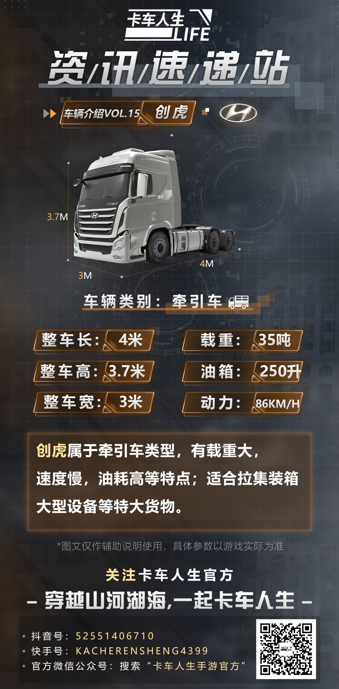 创虎重卡是卡车人生与现代卡车联名的、以现代最新的X cient重卡为原型的重型牵引车,超强的动力给予了它可牵引承载超35吨货物的资本。外观和内饰方面,“创虎”重卡整体形象流畅干练,采用了宽比例线条设计,勾勒出雄壮有力的车身。宽敞的驾驶室内空间配备了可调冷暖的座椅、冰箱以及大型卧铺等舒适性配置,以此减少驾乘人员长途出行的疲劳,也为驾乘者提供了更加舒适自由的环境。