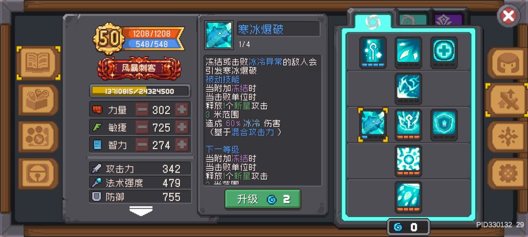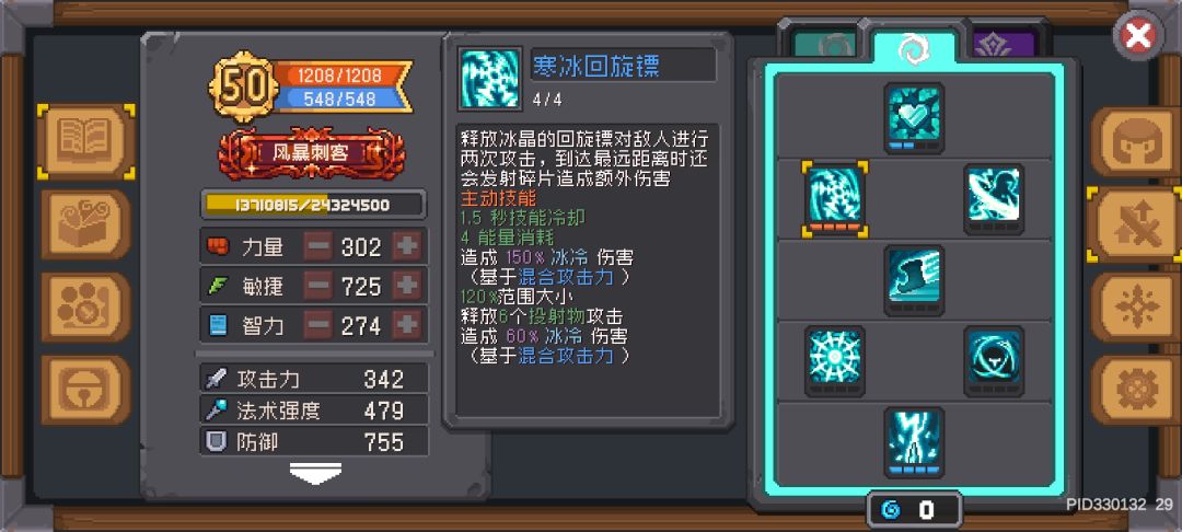 主要的清小怪技能,搭配分裂可以一次放出180度的五个雪花,点满CD只有1.5秒,搭配减冷却可以无限放