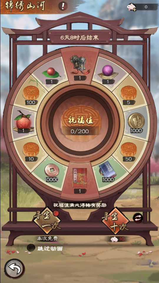 玩家每日有一次免费抽奖的机会,也可以使用【玉兔】进行抽奖获得【月饼】、神兵利器、红品功法等奖励。玩家每次抽奖增加1点祝福值,祝福值满必定获得【赏善罚恶令】或【混元一气功】并清空祝福值。