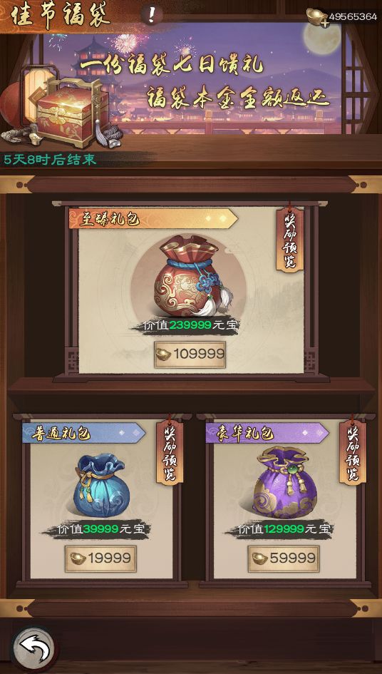 购买礼包可每日领取一份奖励,第七日返还购买礼包所消耗的元宝,未领取的奖励通过邮件补发。