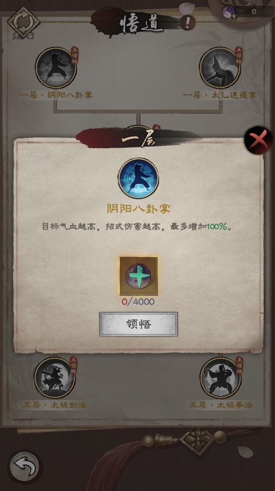 消耗【悟道丹】领悟道法,获得强力技能效果。二层开始领悟道法需先满足领悟条件。