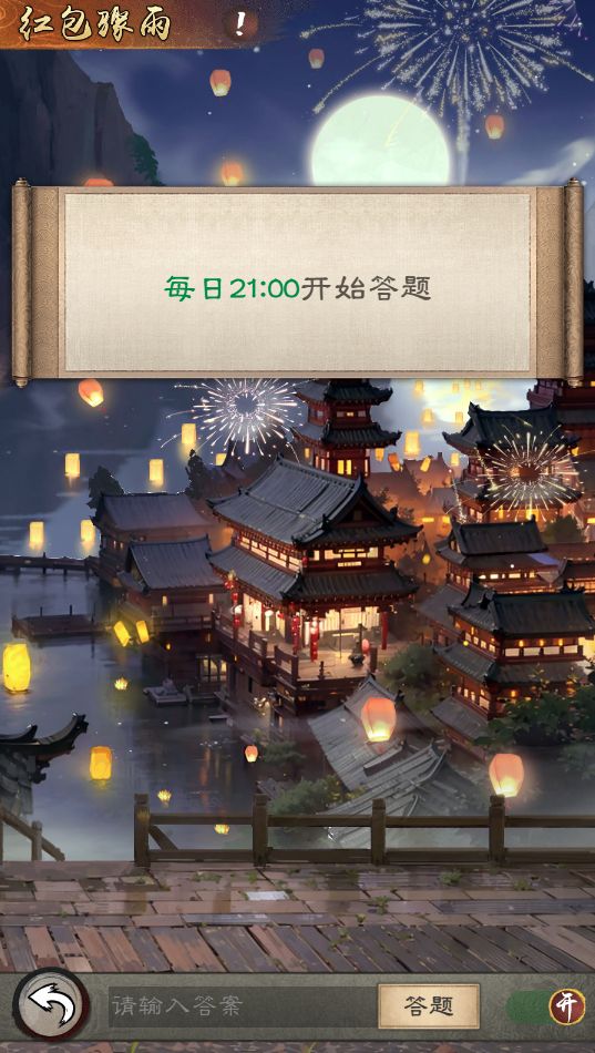 活动期间每天21:00可参与红包骤雨活动,一共有10道题,每次答对题目可获得答题红包。