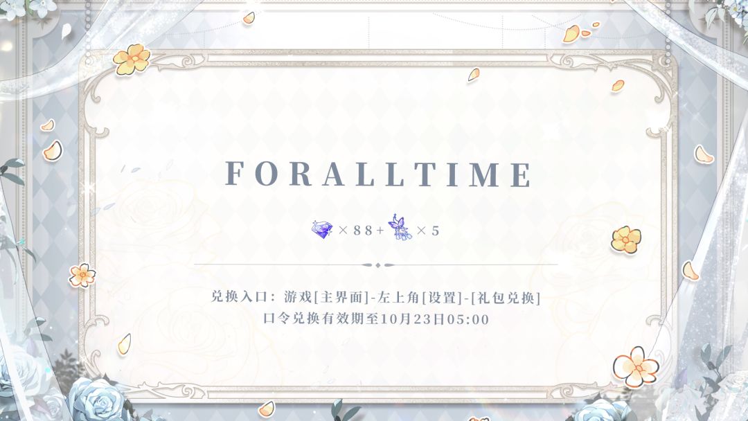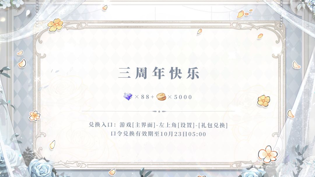 登录游戏,输入口令【三周年快乐】、【FORALLTIME】即可领取[钻石]及培养材料奖励。