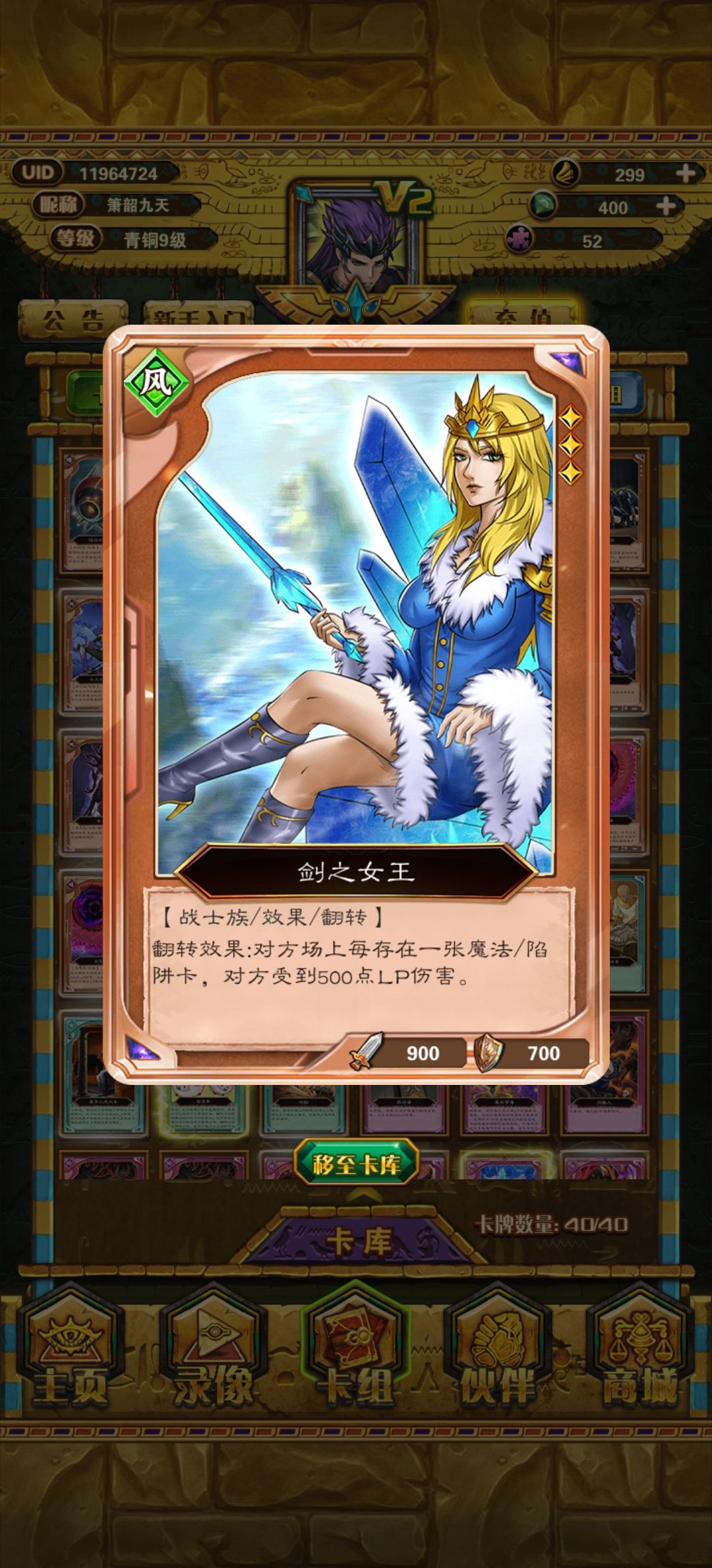别急老弟慢慢看卡组首先,地雷拉满效果效果棒棒哒,可惜我只有两个,然后配合剑之女皇,对面盖一个卡就扣500,盖的越多扣的越多,遇到开局盖4张魔法陷阱的真是爽到不要不要,然后搭配病毒和藤蛇🐍战斗破坏送去墓地扣500。