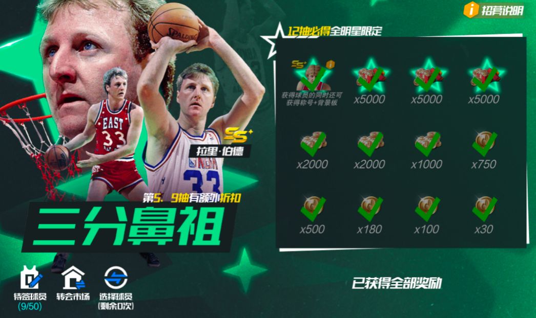 活动期间,可使用【精准招募函】在【精准招募-三分鼻祖】池中,招募全明星队拉里·伯德。