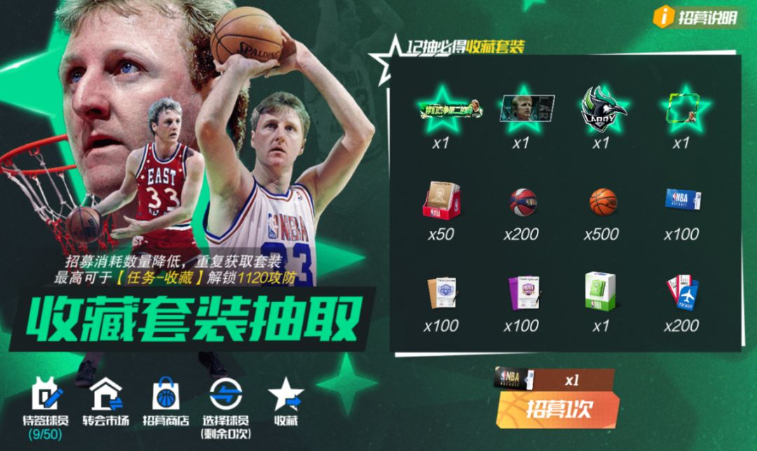 每次“抽一次”,则随机解锁一个奖励格,获取奖励格中的奖励。至多抽取12次,成功将全明星队拉里·伯德签约入队!还可以获得伯德限定称号和背景板!抽完12抽必得外显四件套套装,可用于收藏系统升星!