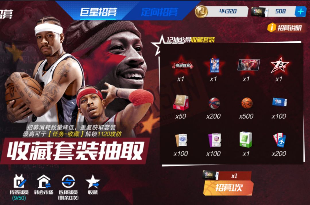 每次“抽一次”,则随机解锁一个奖励格,获取奖励格中的奖励。至多抽取12次,成功将全明星队阿伦·艾弗森签约入队!还可以获得艾弗森限定称号和球员形象!抽完12抽必得外显四件套套装,可用于收藏系统升星!