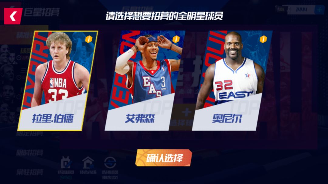 三位全明星球员强势返场!活动期间,可在三分鼻祖(全明星拉里·伯德)、答案永恒(全明星艾弗森)、鲨鱼来袭(全明星奥尼尔)中任选卡池进行招募,获得球员的同时还可获得对应外显!