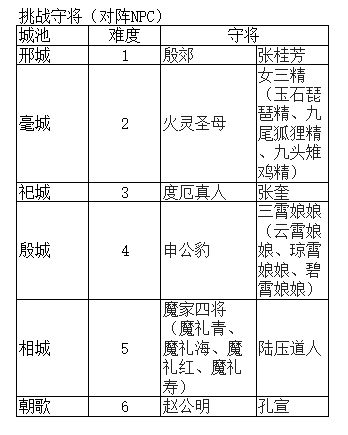每周六晚上(暂定20-21点),双方阵营玩家进入商周对战副本,对城池进行争夺,每周只能对一个城池进行争夺,争夺后进度保存。双方城池丢失后下周可争夺回来,当一方城池全部丢失后,则失败。本玩法采取赛季制,赛季结束发放最终奖励,新赛季重置双方城池。