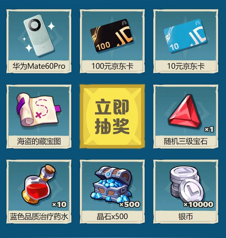 完成连续登录、国战活动等任务,单个账号即可获得高达5次抽奖机会,【100元京东卡、华为Mate 60 Pro】等万元实物大奖等你来抽!