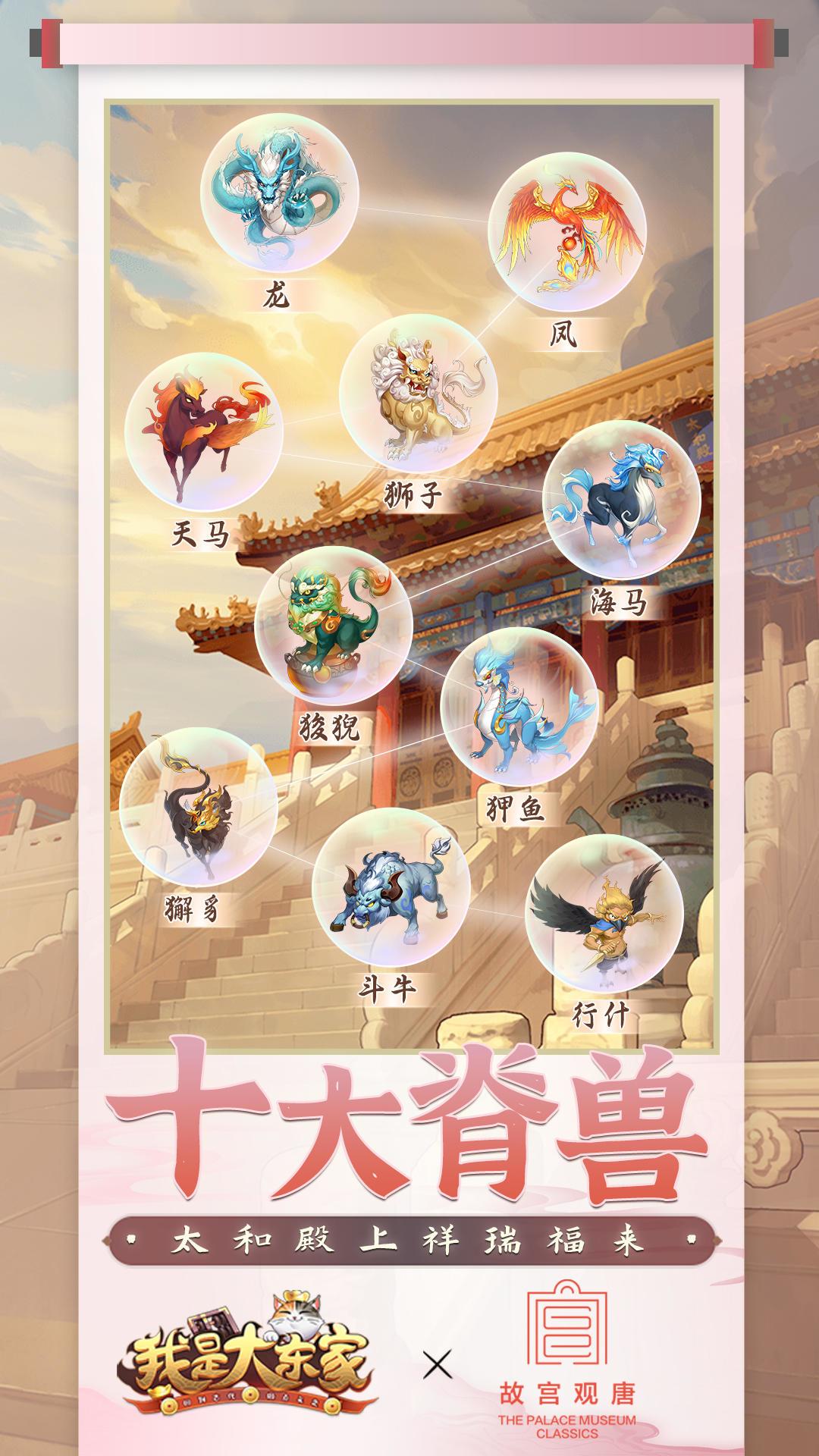 在本次我是大东家与故宫观唐的梦幻联动中,龙、凤、狮子、海马、天马、押鱼、獬豸、狻猊、斗牛、行什这十大脊兽将化身祥瑞,来到大东家世界中展开冒险,宫中风云一触即发,各位大东家还将触发各种宫中随机事件,你准备好开启神秘挑战了吗?