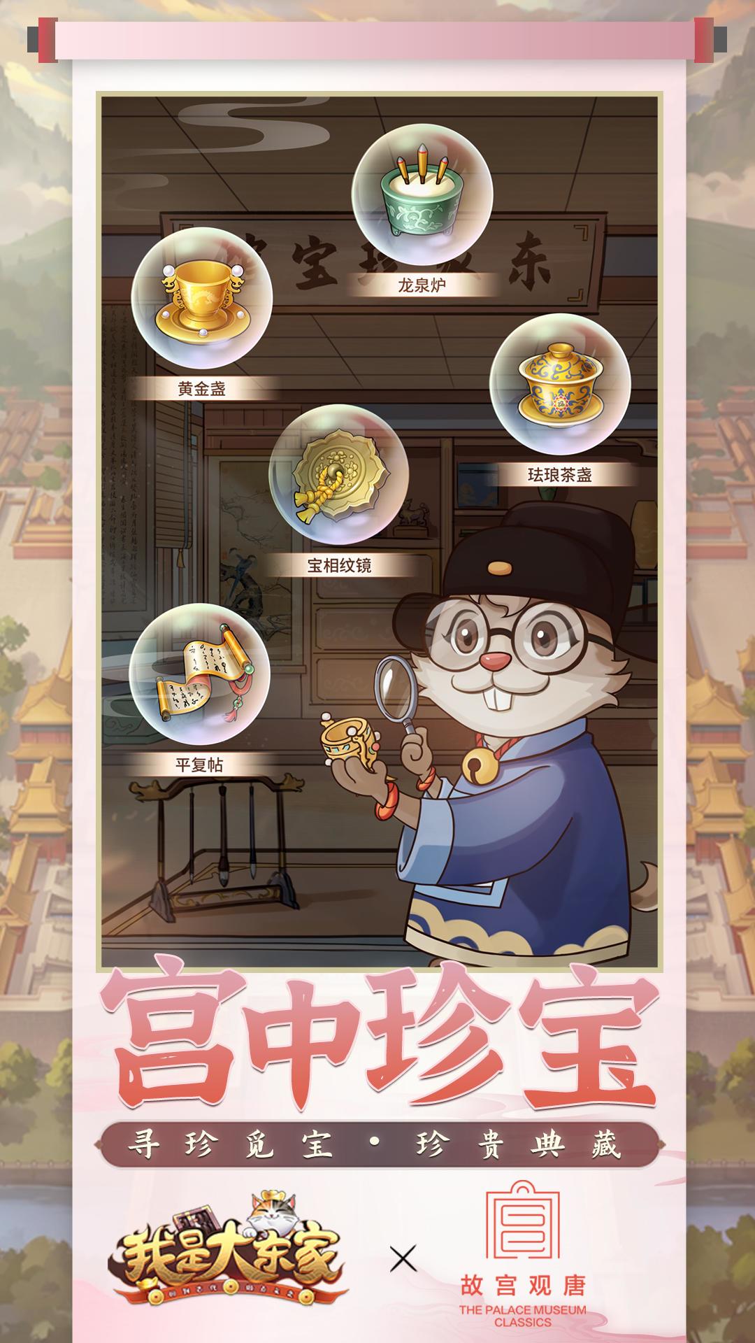 在本次惊喜联动中,故宫十大宝物——宫廷之宝、漆器之宝、玉器之宝、珐琅之宝、书画之宝、法帖之宝、钟表之宝、织绣之宝、陶瓷之宝、青铜之宝,也来到了《我是大东家》的游戏世界里!